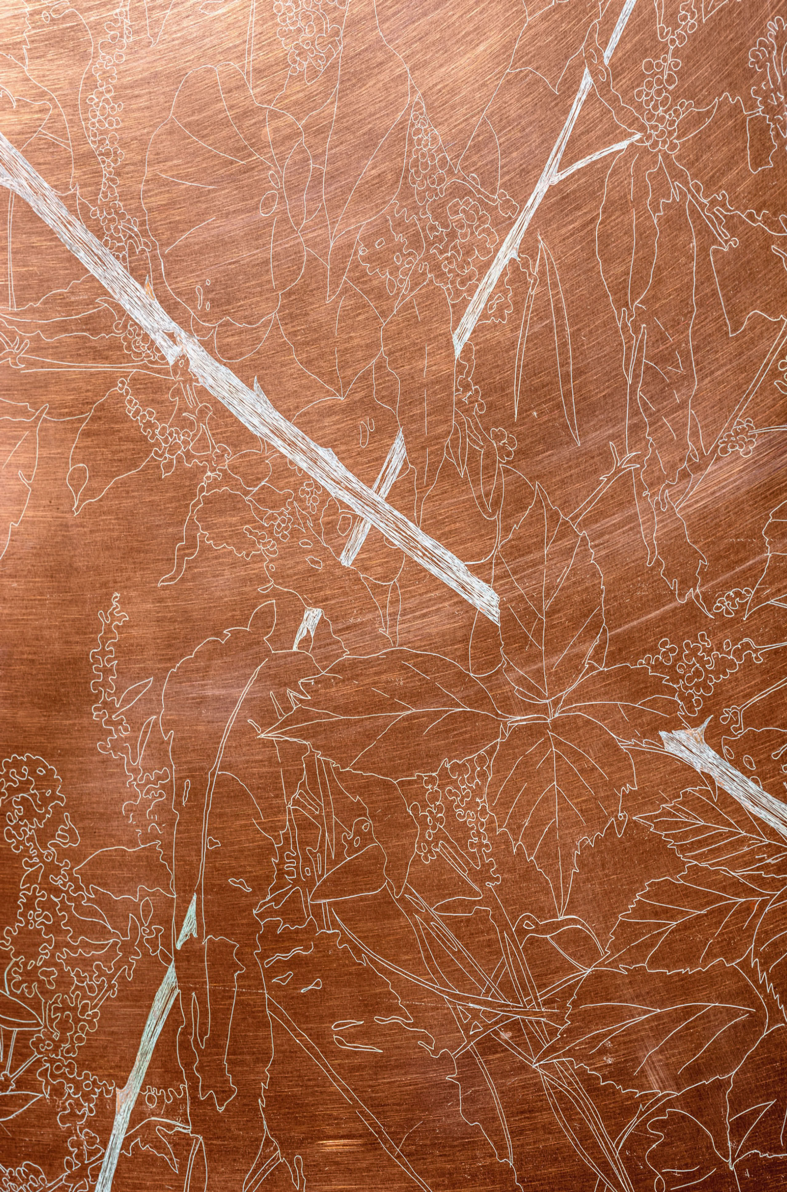 Sans titre (détail), 2023, Plaque de cuivre gravée et pliée, 195 x 100 cm.