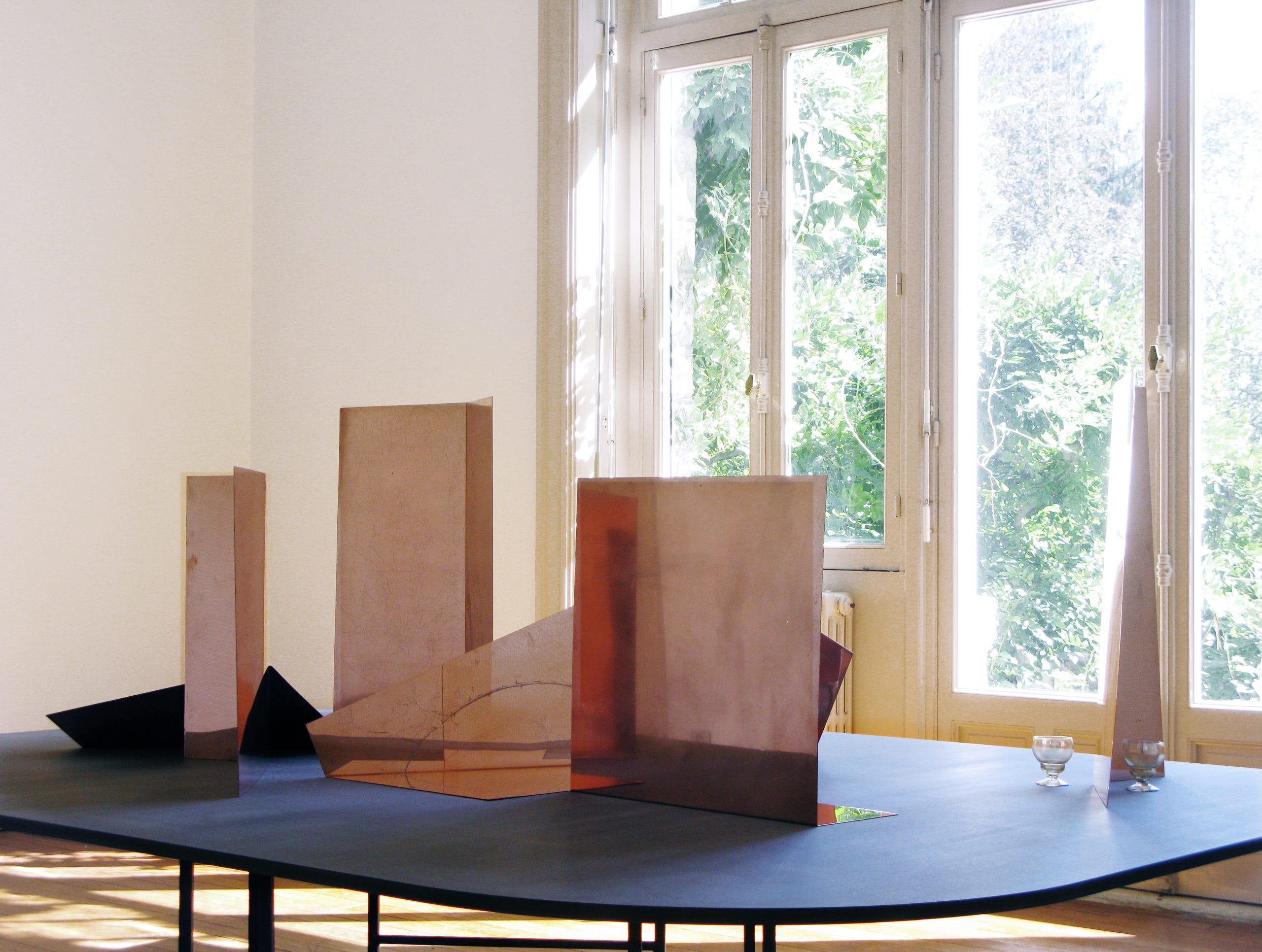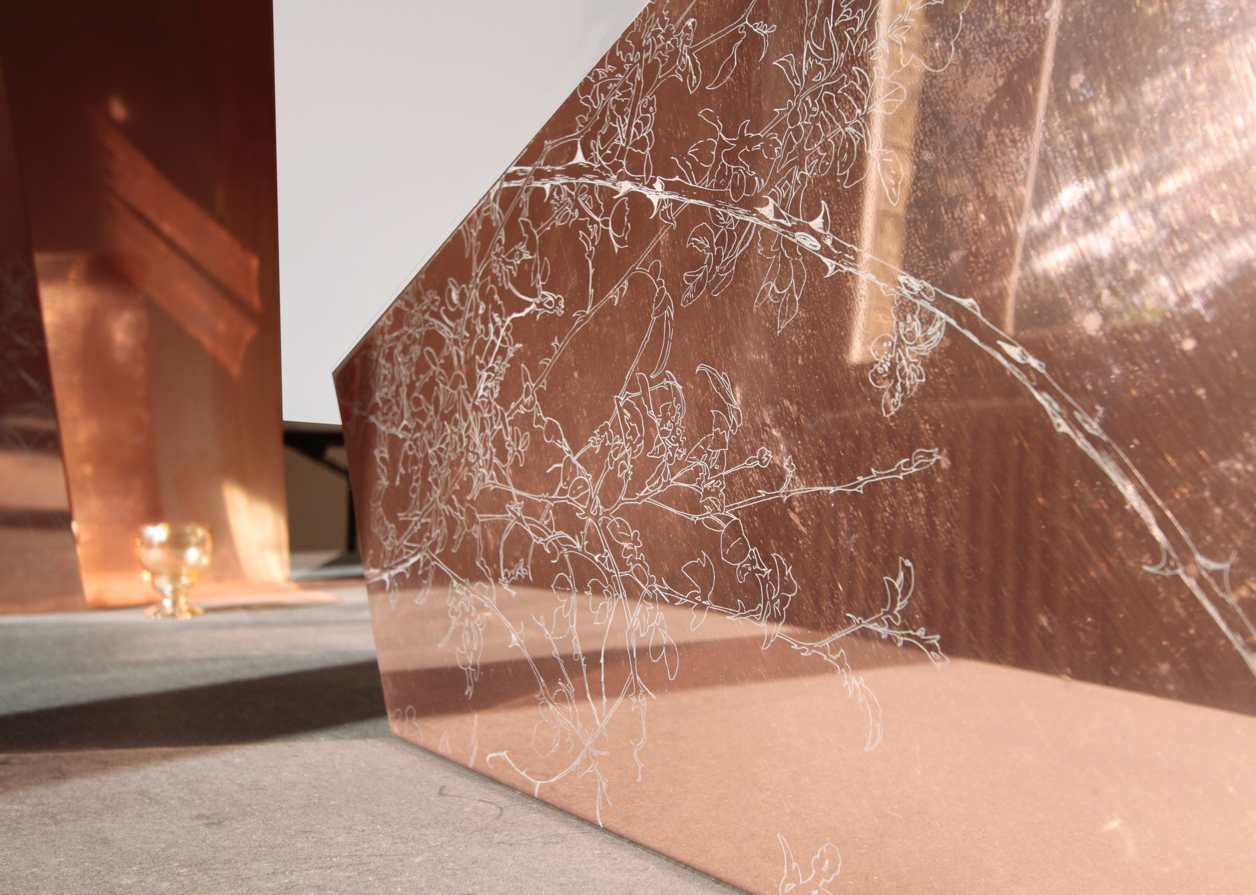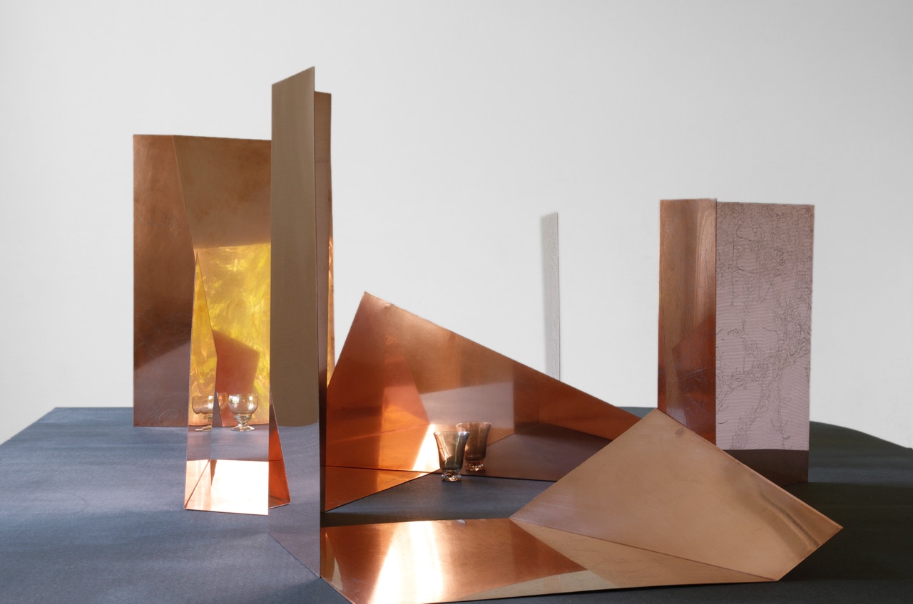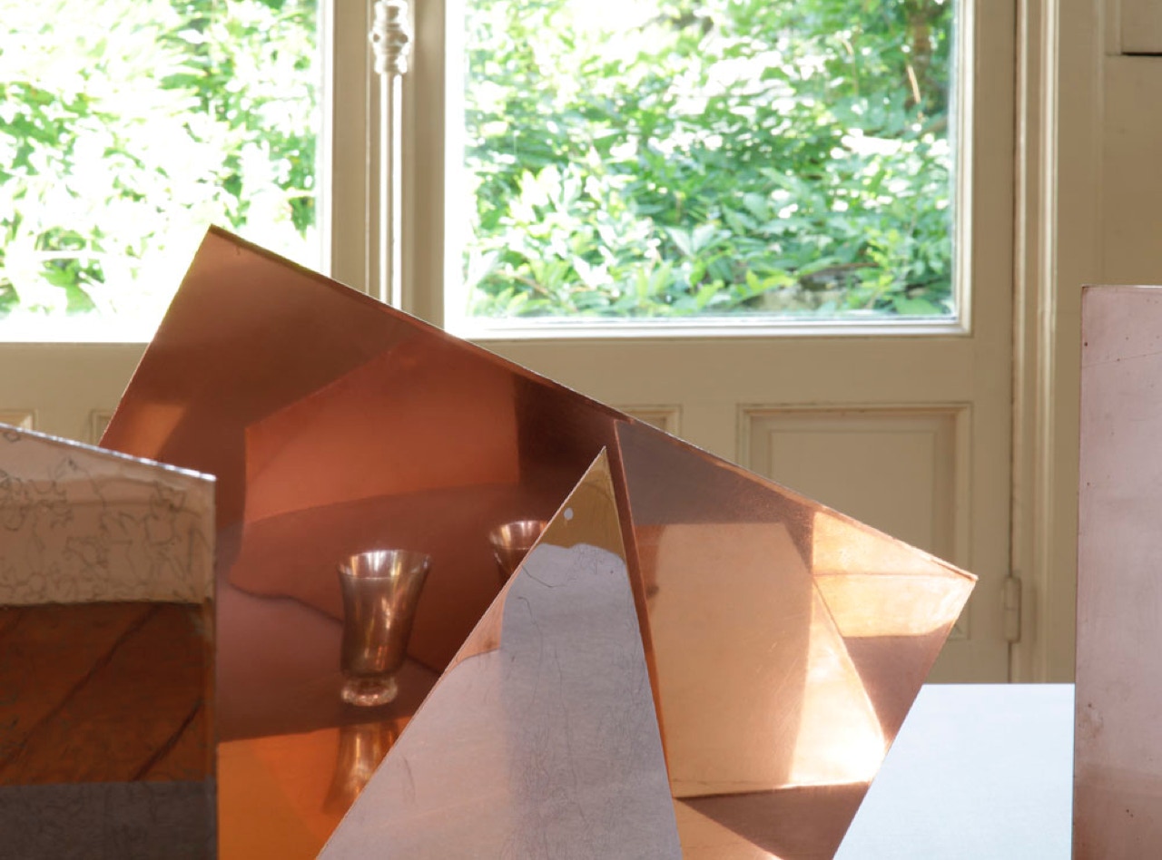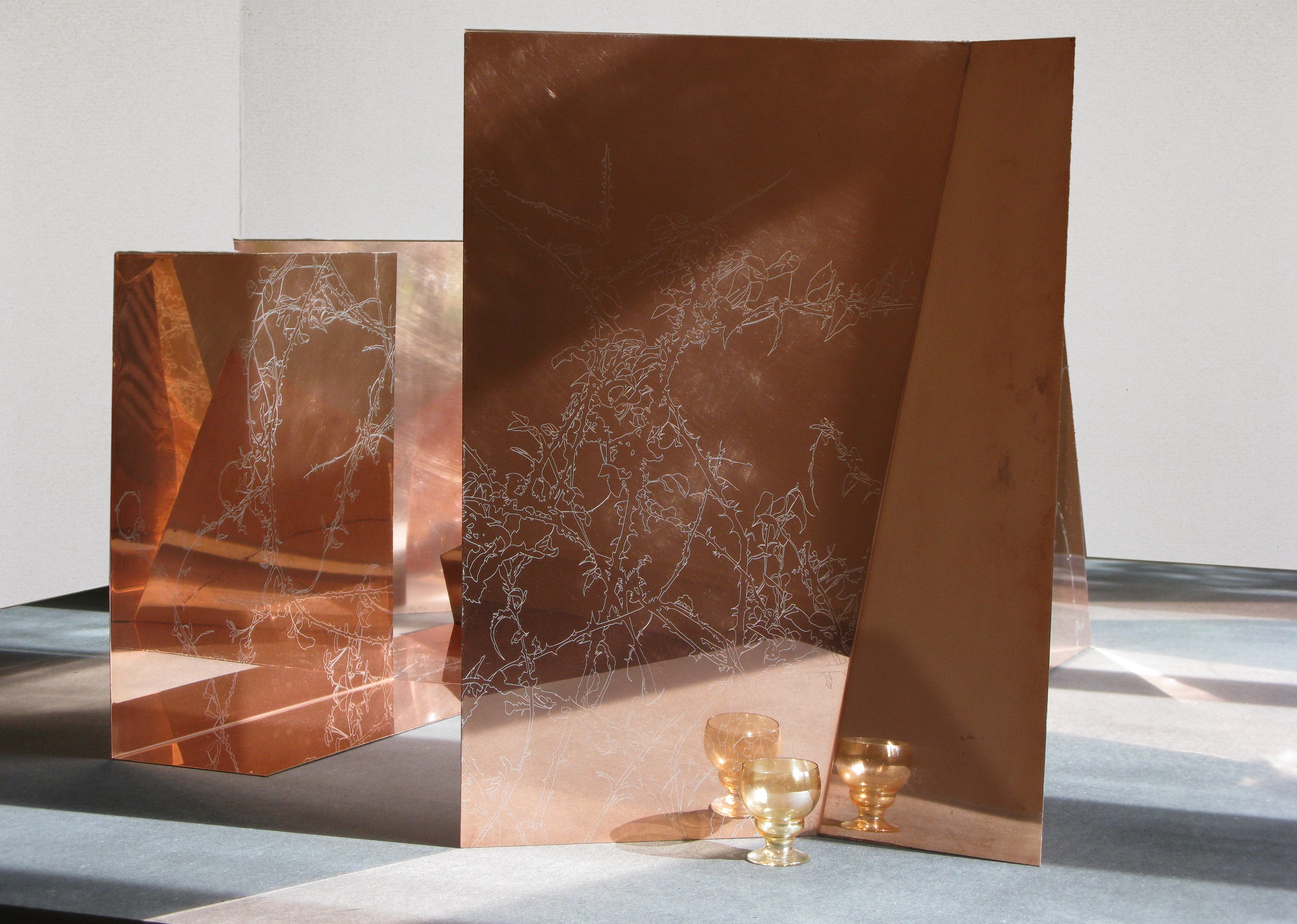 Composition aux cuivres, engraved copper sheets and 3 glasses.