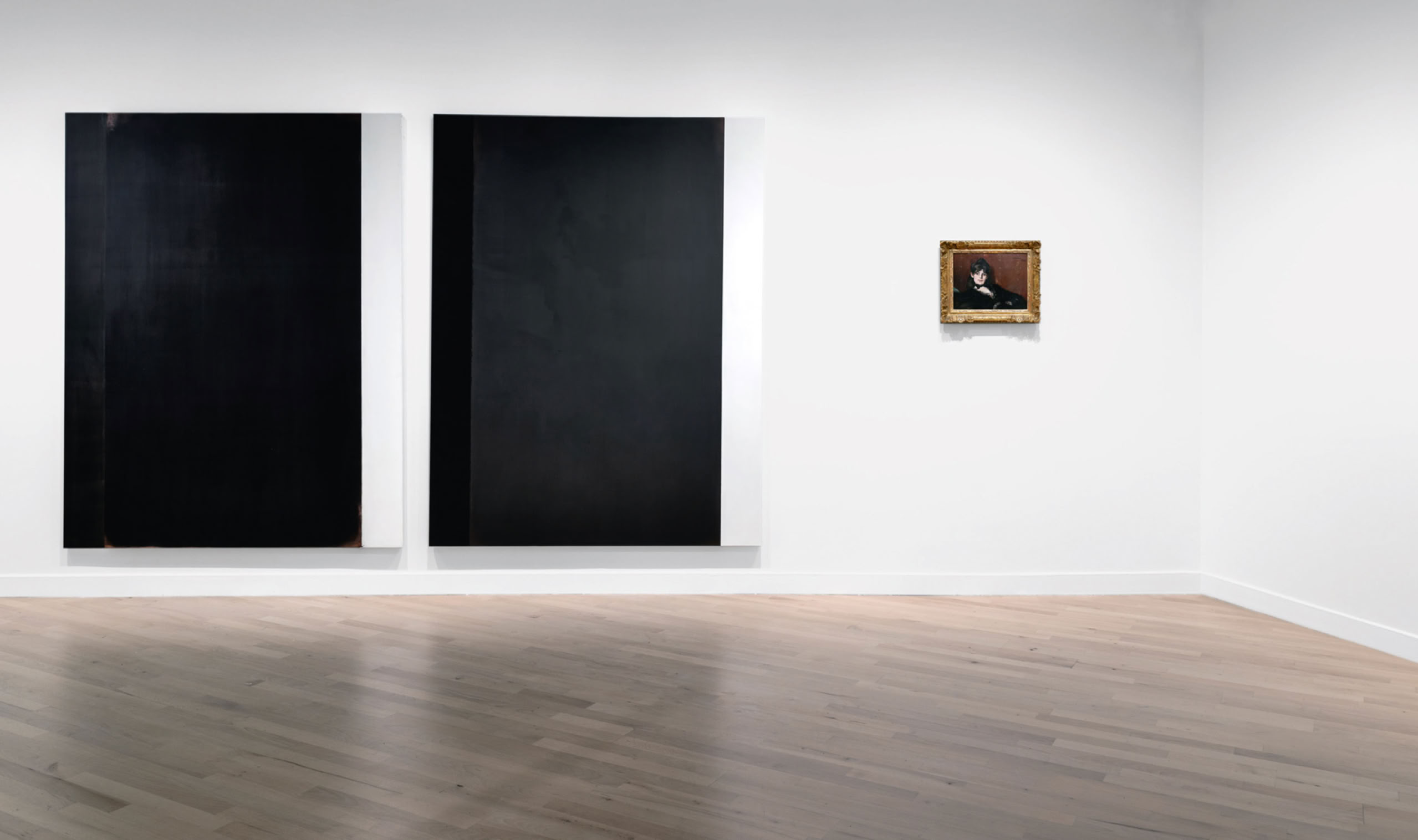 Composition noire à la bande blanche I, 2014, acrylique sur toile, 195 x 150 cm; Composition noire à la bande blanche II, 2023, acrylique sur toile, 195 x 150 cm et Édouard Manet, Portrait de Berthe Morisot étendue, 1873, Musée Marmottan Monet, Paris.
