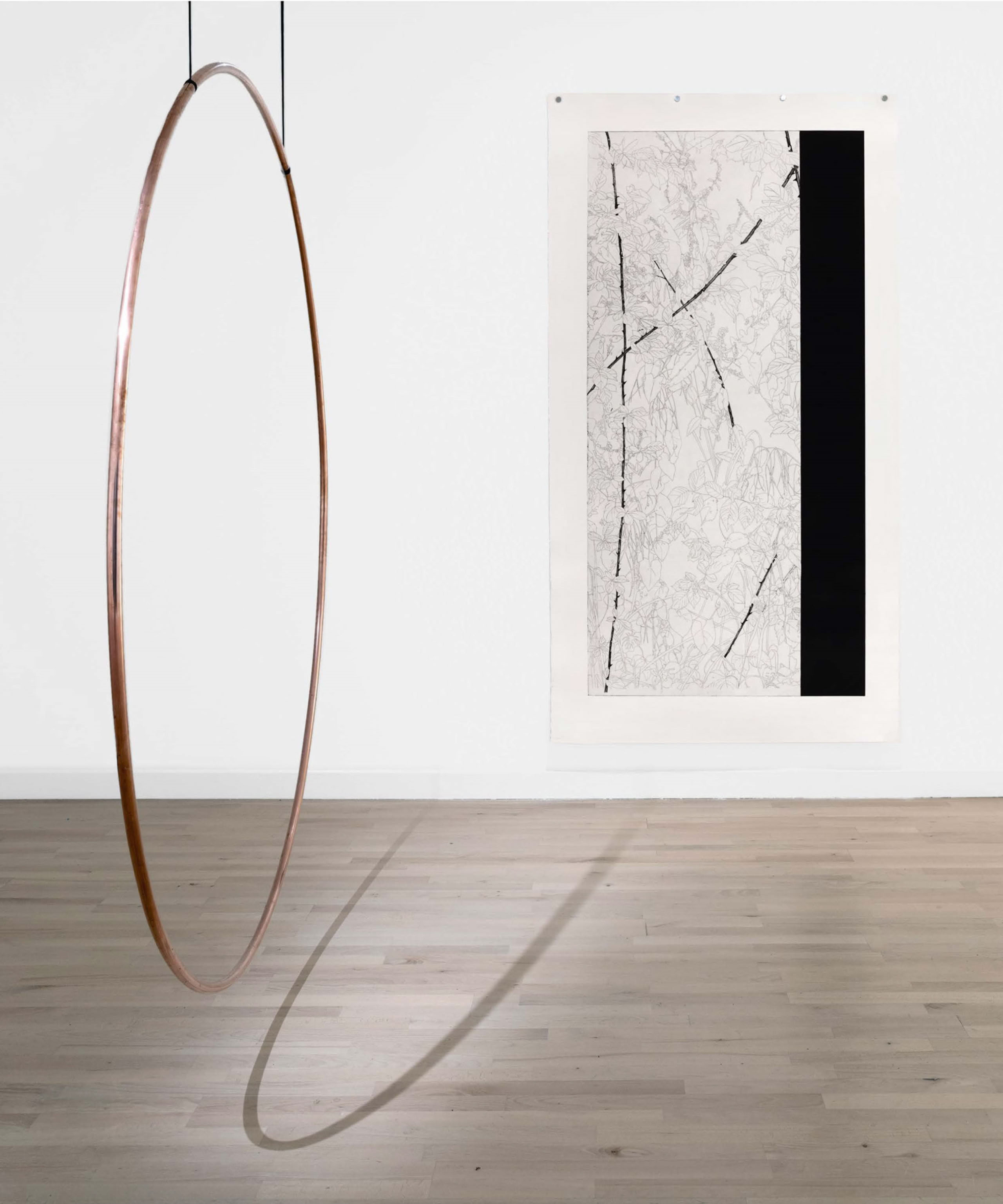 Circle Sculpture II, 2023, bois et cuivre, diamètre 195 cm, (production CEAAC) et Brambles I, 2023.
