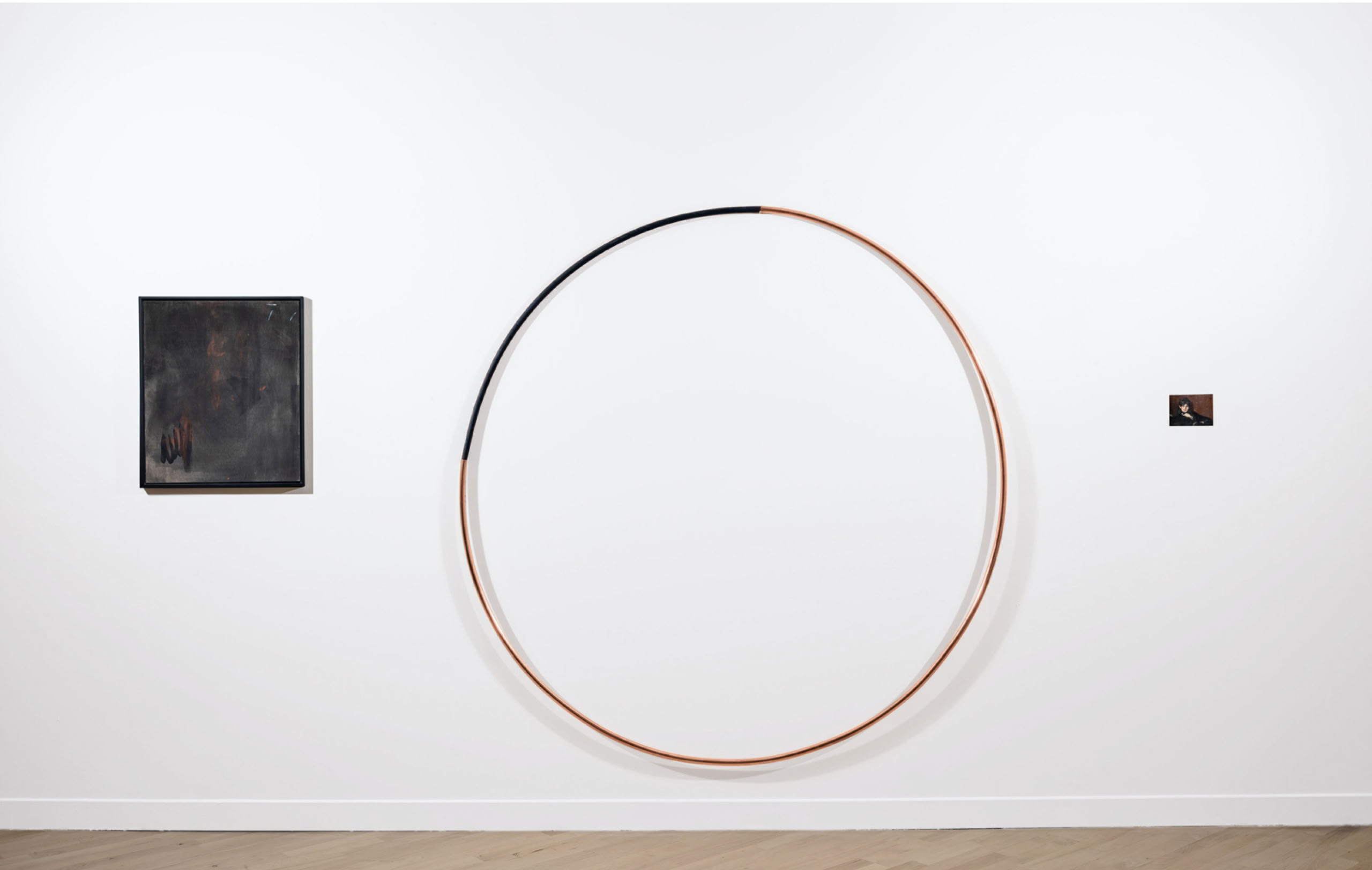 Contrepoint noir, 2014, Circle Sculpture, 2023, bois et cuivre, diamètre 195 cm, (production CEAAC) et carte postale du Portrait de Berthe Morisot étendue, 1873, par Édouard Manet.
