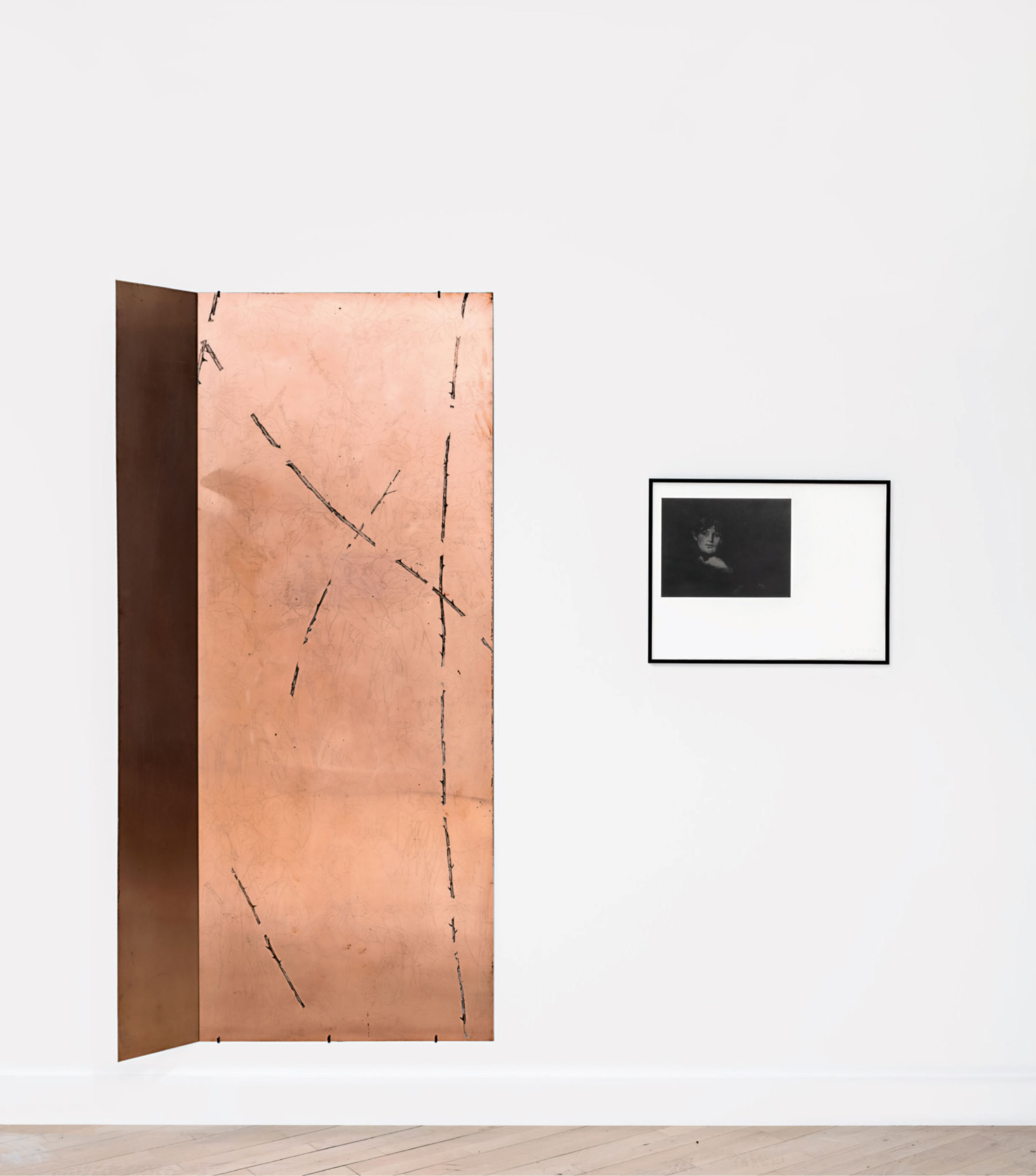 Sans titre, plaque de cuivre gravée et pliée, 195 x 100 cm. 2023 et Portrait de B.M. étendue, 2023, héliogravure, 45 x 60 cm.