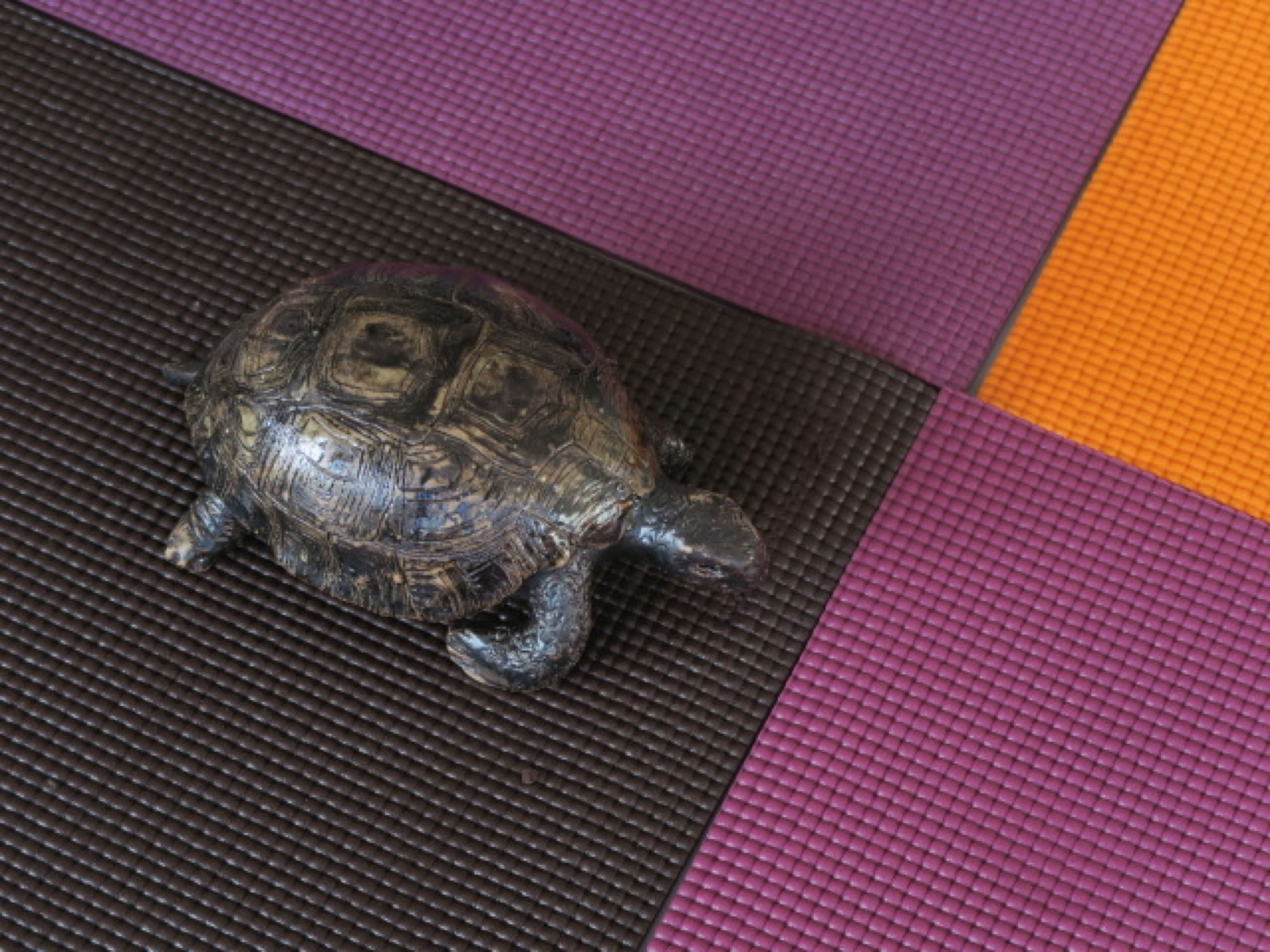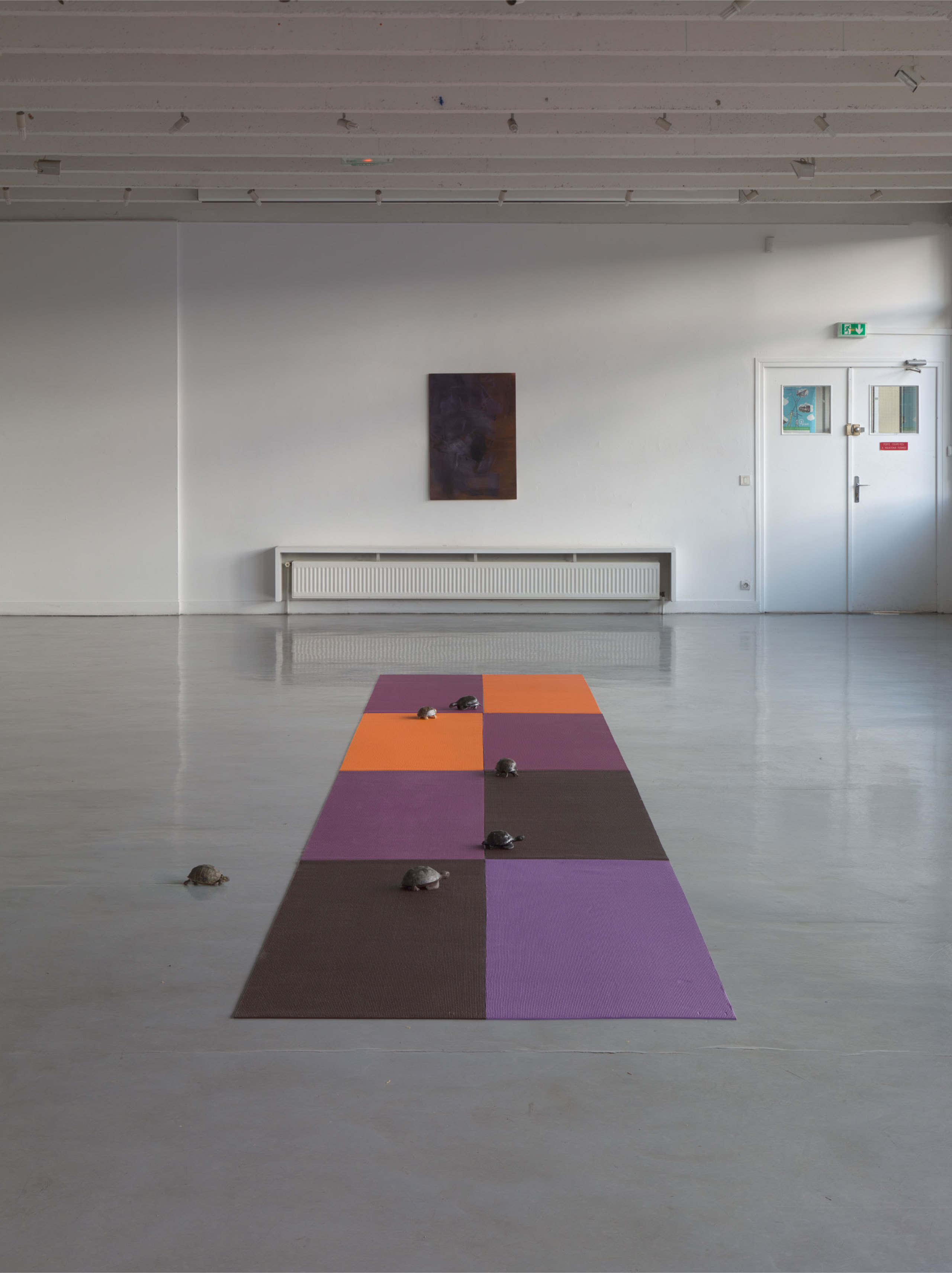 Installation view: yoga mattresses, ceramic turtles and a real one.