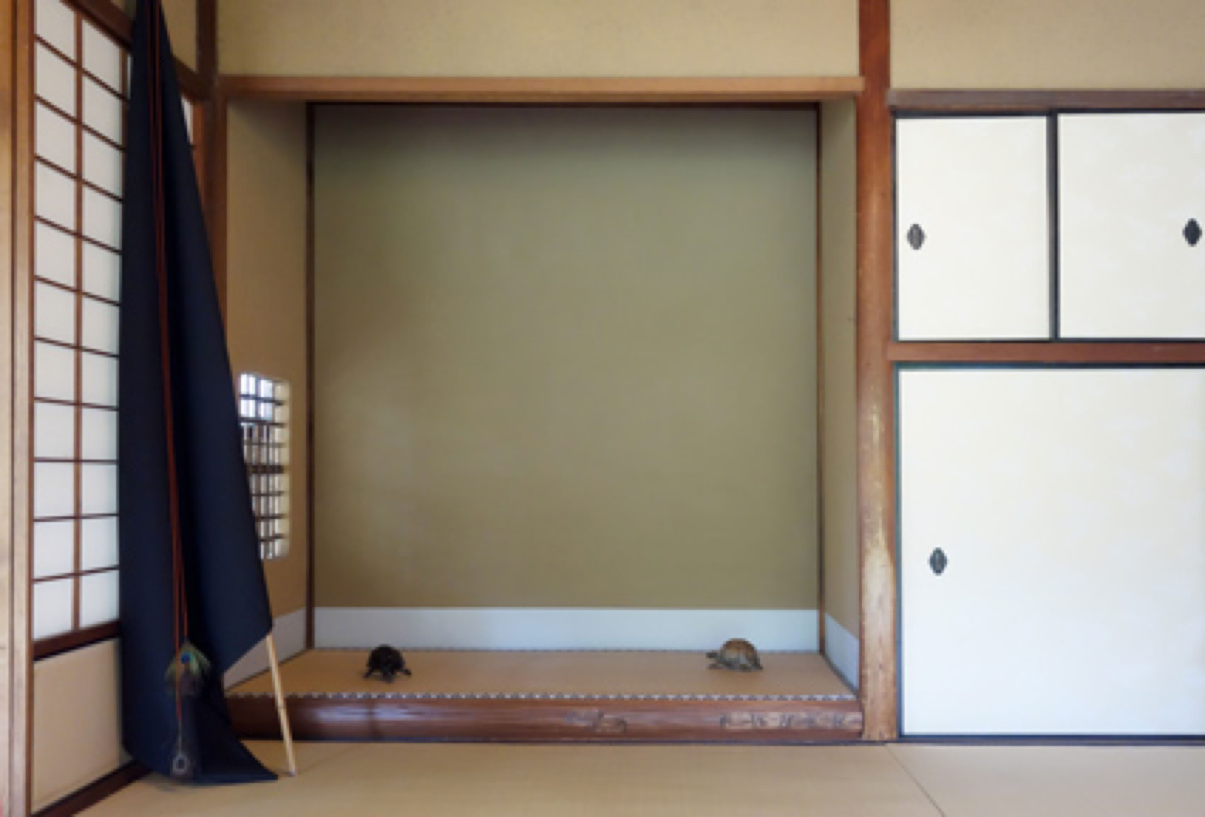 Installation view, composition with a flag and two turtles.